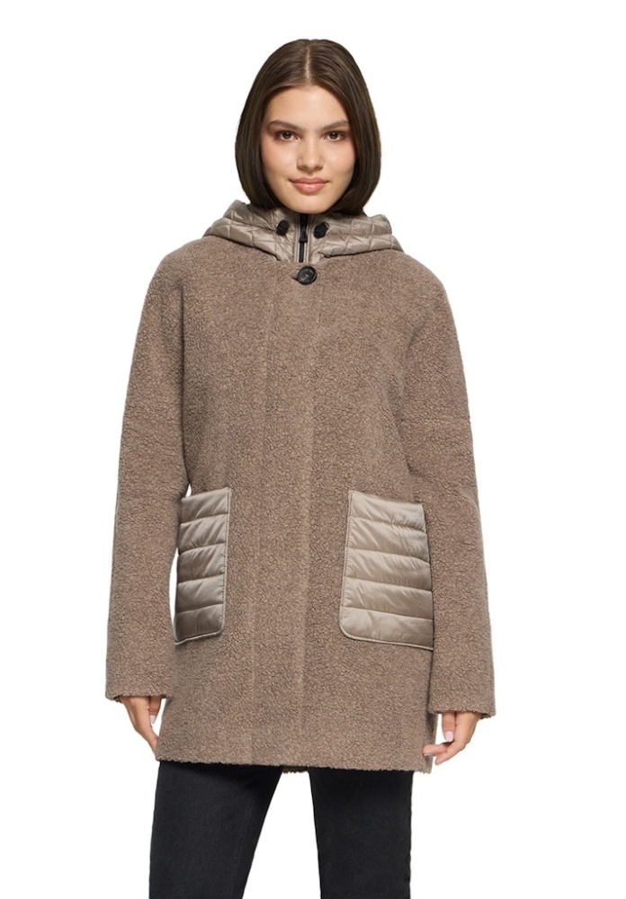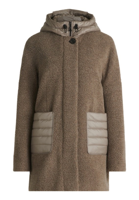 Kurtka wyróżnia się wysoką elegancką pikowaną stójką z kaptutrem, oraz tak samo pikowanymi kieszeniami, które nadają mu charakteru. Prosta, klasyczna, luźna forma płaszcza z długimi rekawami, sprawia że jest on nowoczesny oraz ponadczasowy.